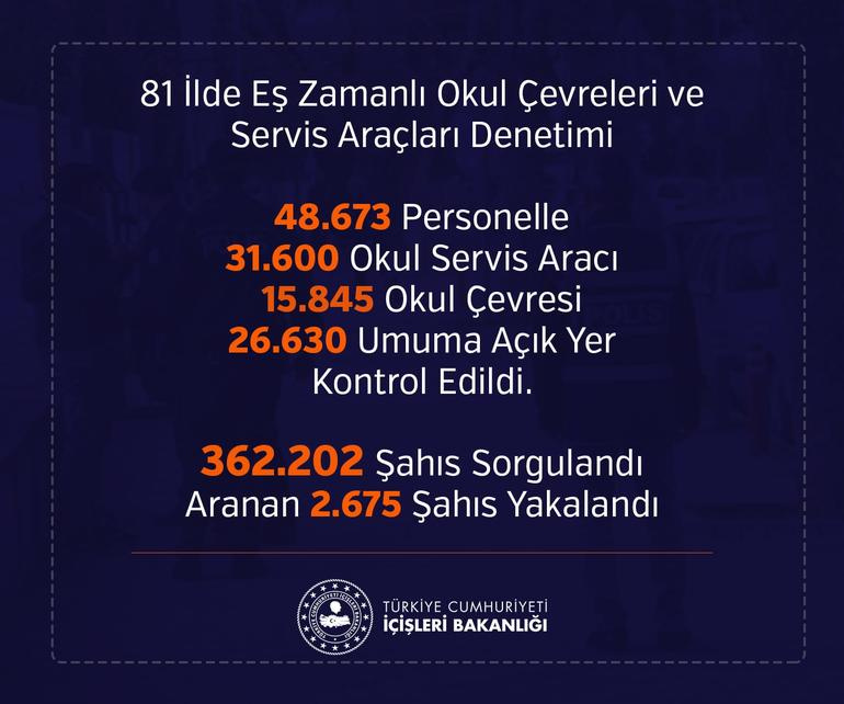 ARANAN 2 BİN 675 KİŞİ YAKALANDI: Denetimlerde; okullar çevresinde ve umuma açık yerlerde bulunan 362 bin 202 şahıs sorgulandı. 2 FETÖ/PDY, 24 uyuşturucu suçları, 12 cinsel suçlar, 63 yaralama, 31 hırsızlık, 18 dolandırıcılık, 25 tehdit, 10 hakaret, 5 kayıp çocuk, 2 bin 261 yoklama kaçağı-bakaya, 224 diğer suçlardan olmak üzere toplam 2 bin 675 aranan şahıs yakalandı.