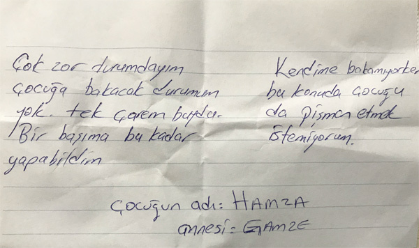 Bir süre anneyi arayan güvenlik görevlileri, çocuğun üzerindeki ‘artık bakamıyorum, tek çarem buydu’ şeklindeki notu buldu. Bunun üzerine güvenlik görevlileri, durumu polise bildirdi. Notun üzerinde çocuğun ismi Hamza, annenin isminde ise Gamze yazılıydı.